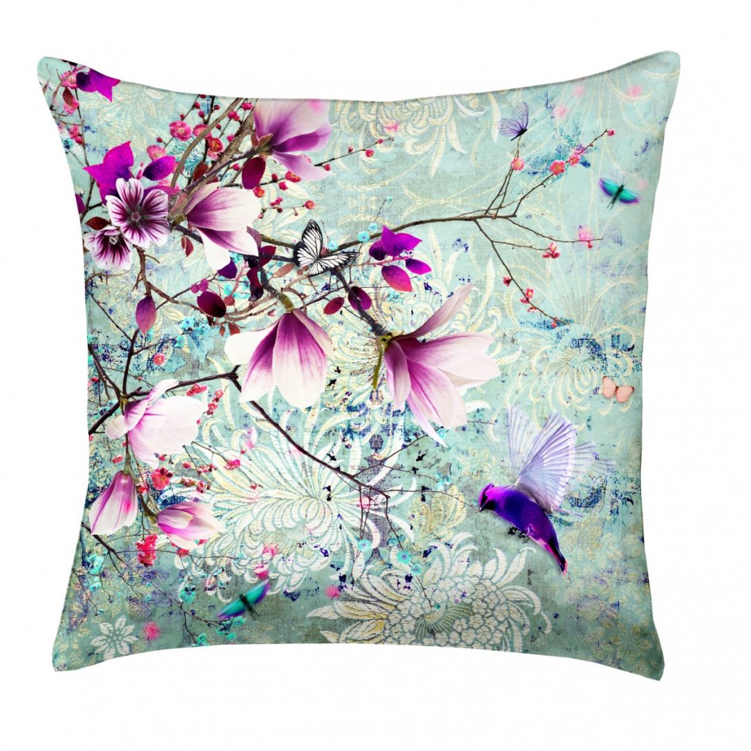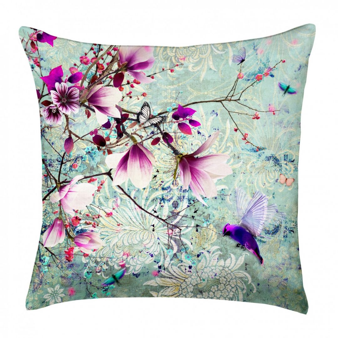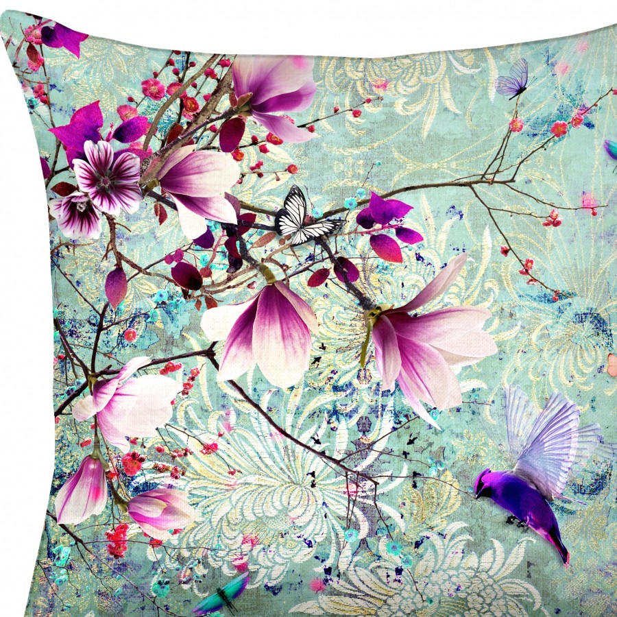 Soft subtle pastel green cushion of a harmonious flower garden scene featuring bold brightly coloured flowers and creatures that stands out on both silk and linen.