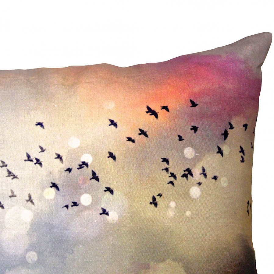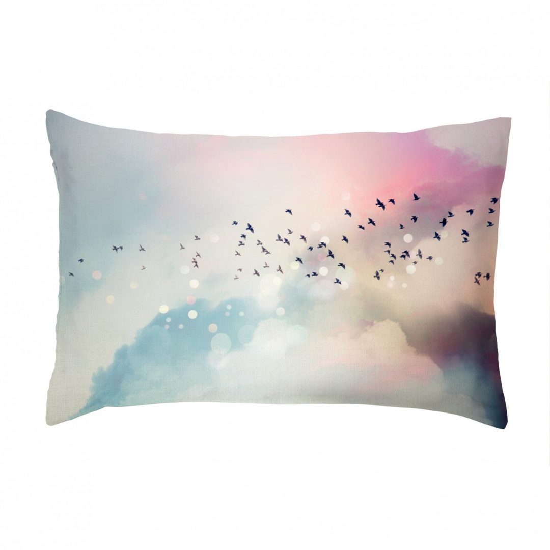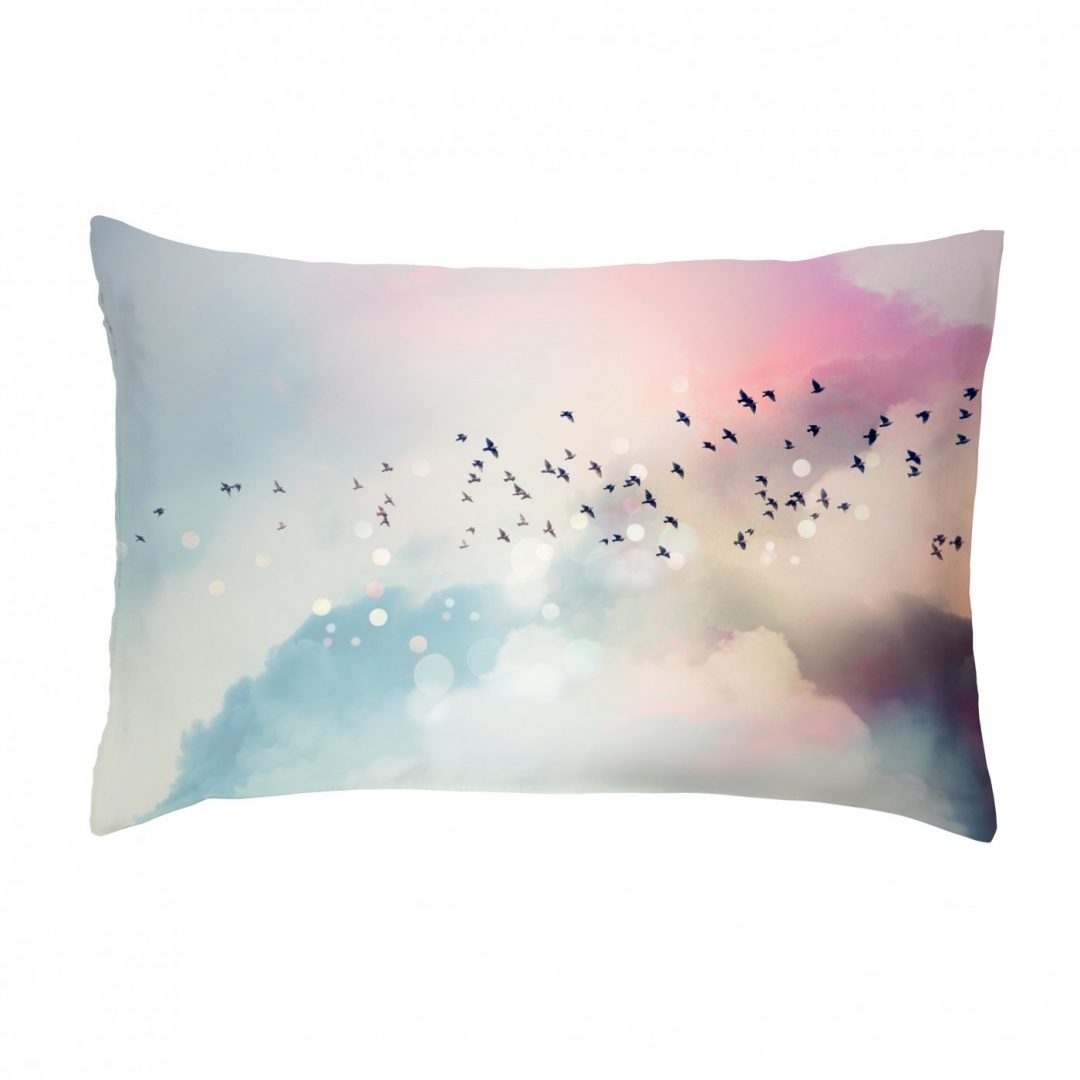 A mix of blues creates a dreamy cloudy French sky with birds flying into a pink sunset.