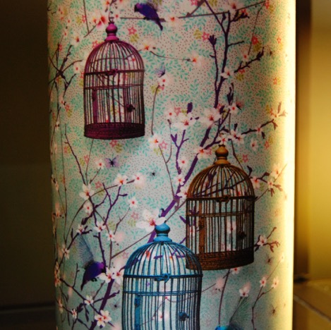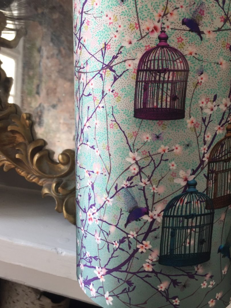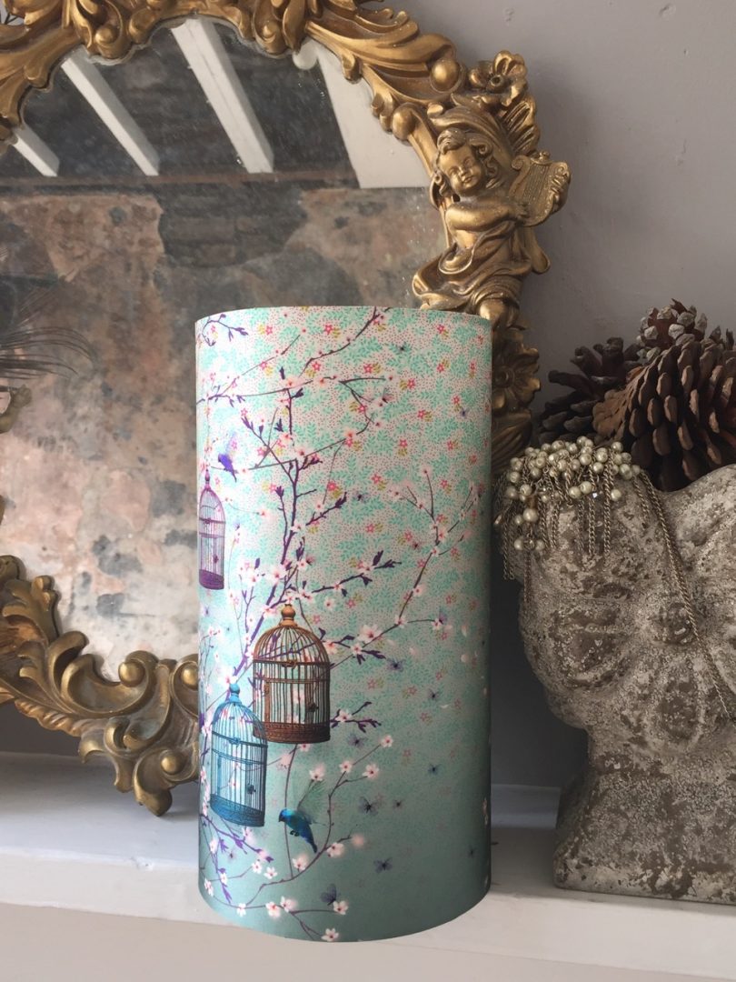 A luxurious silk cylinder shade with design print called ‘Melodie’. A magical nature scene of hummingbirds fluttering around a pink blossom tree which has dark purple branches with birdcages hanging from them. The teal coloured shade comes to life when lit as the light shines through the subtle pink blossoms creating an eye catching piece.